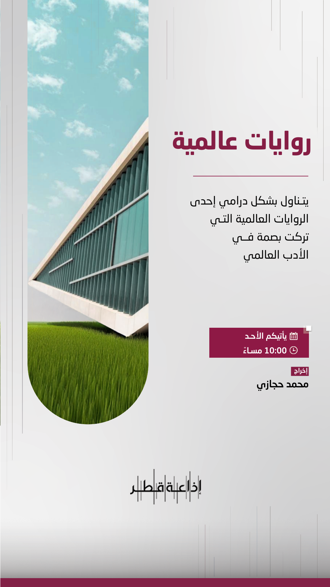 برنامج حواري ثقافي يستضيف في كل حلقة مفكرا من قطر أو العالم العربي , للتحاور حول قضية فكرية معاصرة , يدور الحوار بلغة مبسطة دون الإخلال بالعمق و يهدف إلي تقريب الفكر إلي الجمهور و تقيم التجارب و إبتكار الحلول .